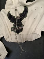 Details:• Soft thermal waffle knit fabric• Quarter zip cropped silhouette• Distressed details on sleeves and hem• R Eagle crest graphic• Crystal accents throughout• Crystal chain zipper pull• Hand distressed and one of a kind