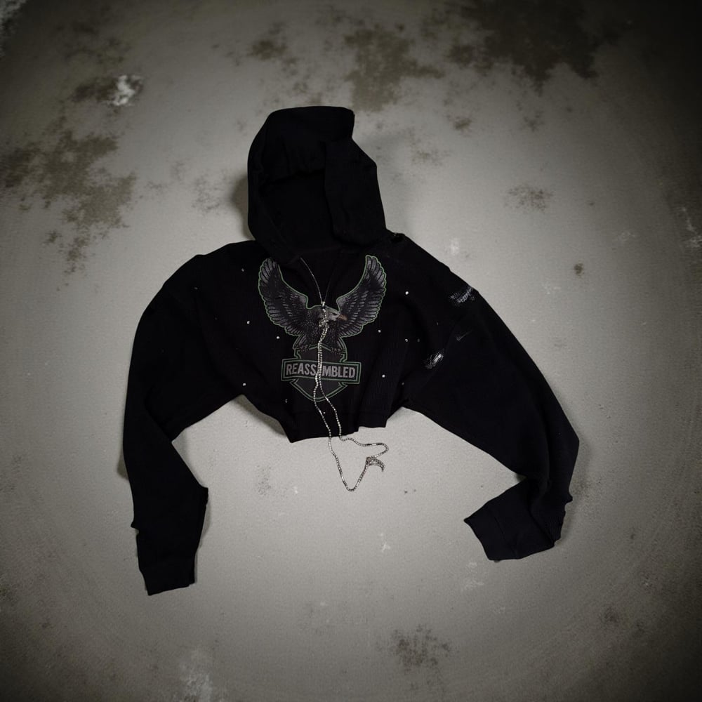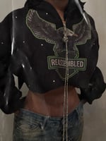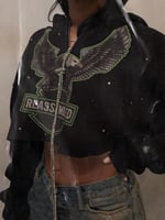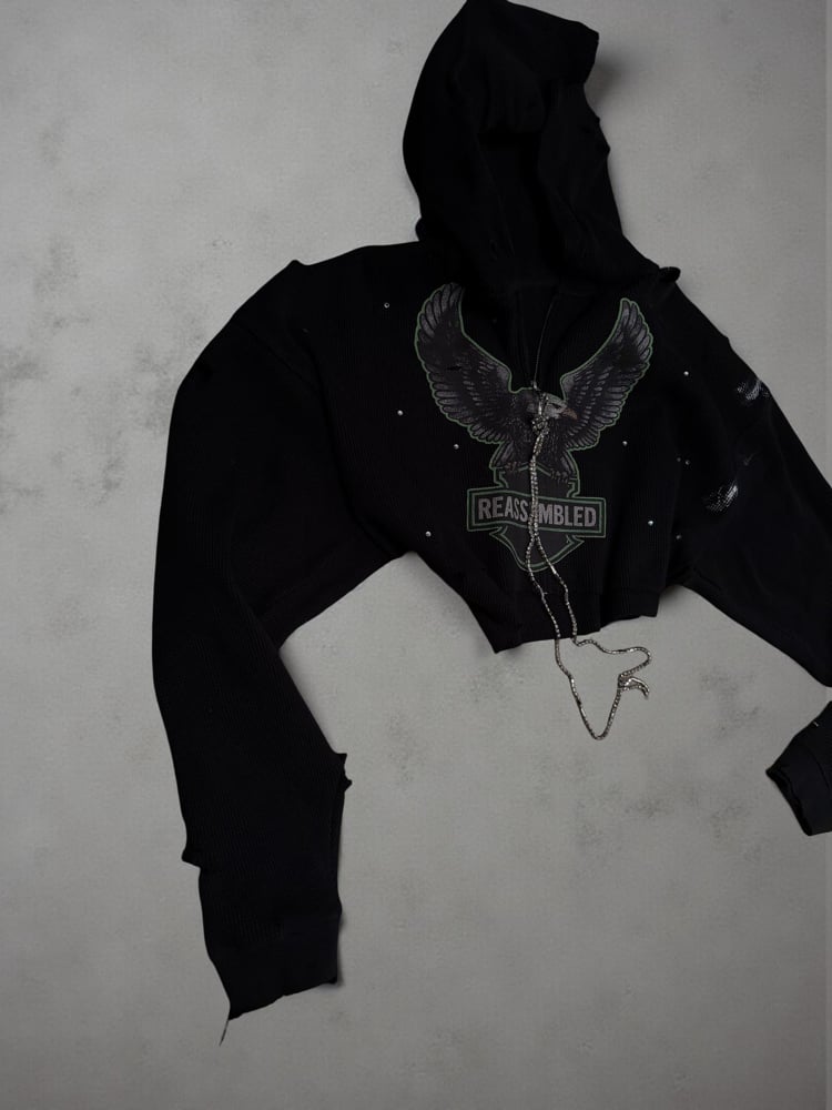 Details:• Soft thermal waffle knit fabric• Quarter zip cropped silhouette• Distressed details on sleeves and hem• R Eagle crest graphic• Crystal accents throughout• Crystal chain zipper pull• Hand distressed and one of a kind