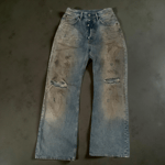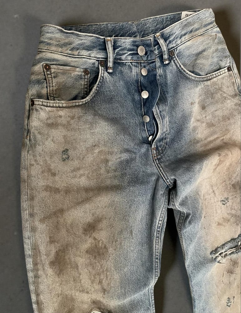2021 jeans are cut to a regular fit with a mid-rise waist, wide straight legs with a slight flare from the knee, and a long length. Featuring an authentically dirty look created by an eco stonewash on a rigid indigo denim with manual dirt marks and paint stains.