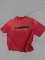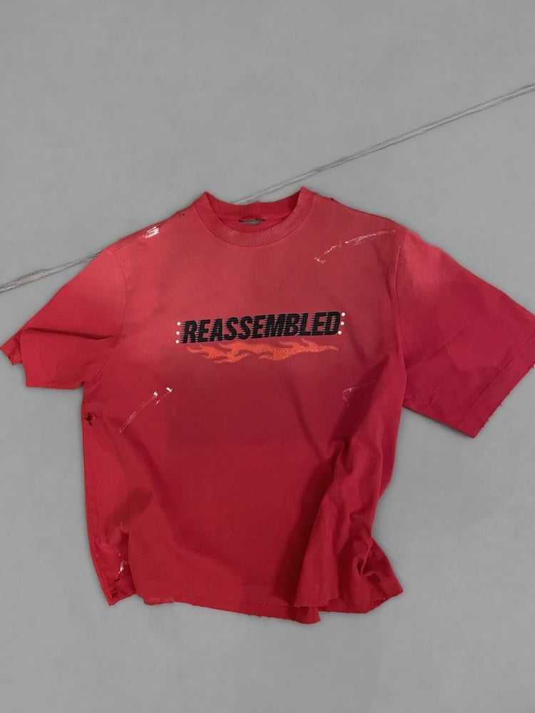 Sun-faded crimson red tee featuring the REASSEMBLED logo in bold black lettering over a flame graphic, accented with small crystal accents. Distressed details, raw edges, and subtle paint marks give it a worn-in vintage feel.