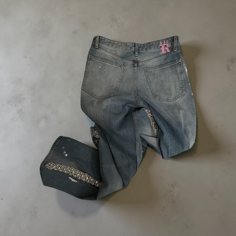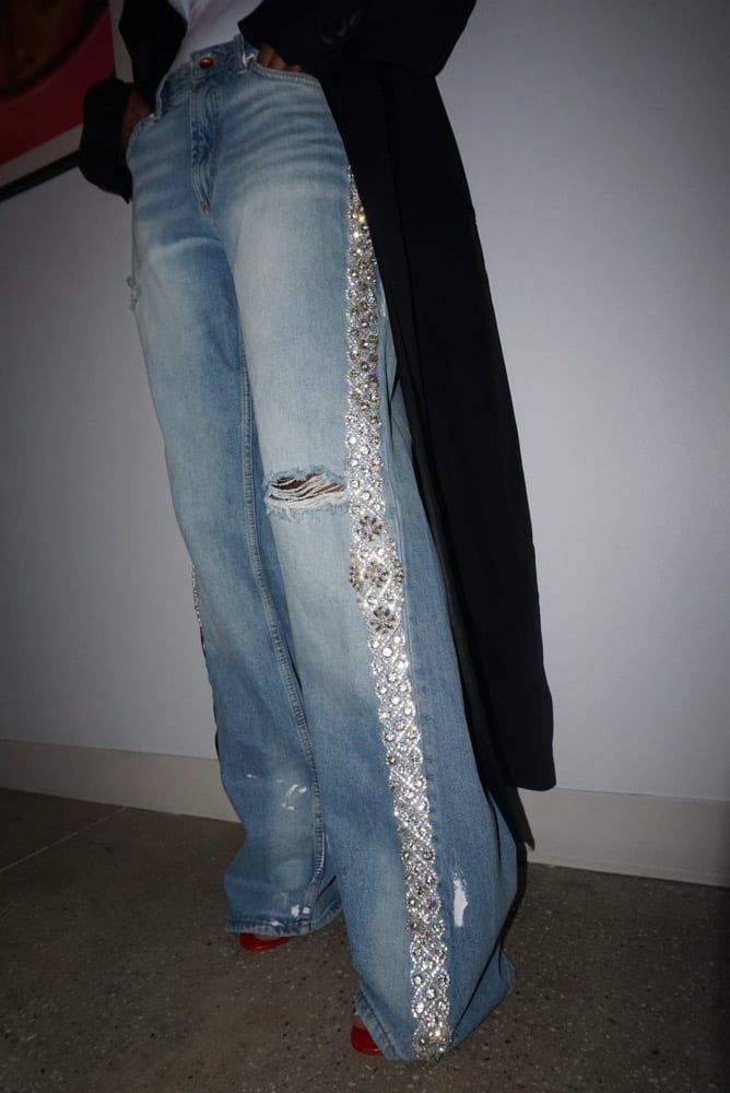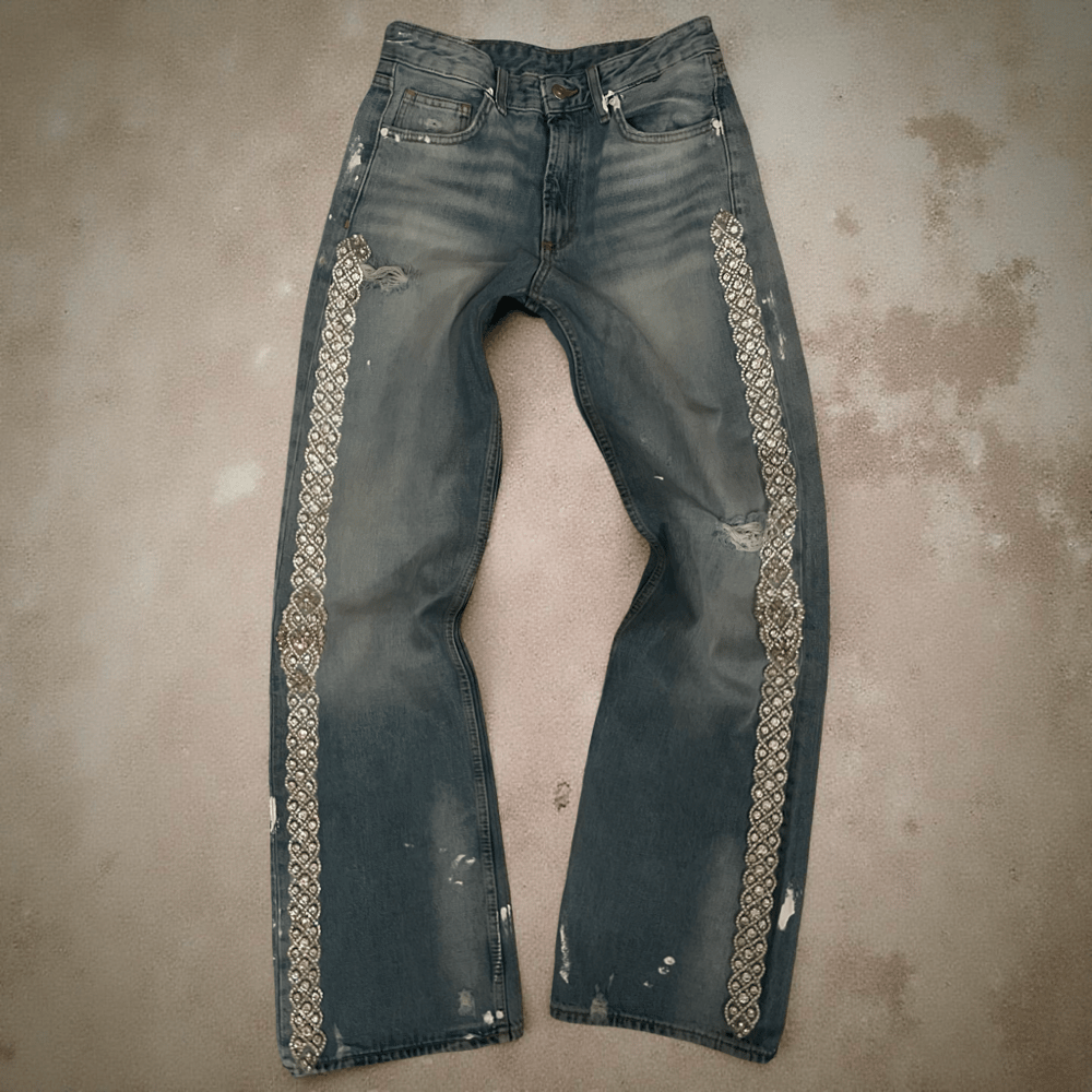 A statement pair that redefines denim luxury. These premium medium wash jeans feature hand-embellished crystal tuxedo stripes running down each leg, giving them a sharp, tailored edge with a touch of rockstar glamour. Distressed details and paint splatter accents add contrast, balancing the refined sparkle with a rugged attitude. Designed to turn heads, these jeans blur the line between streetwear and evening wear.