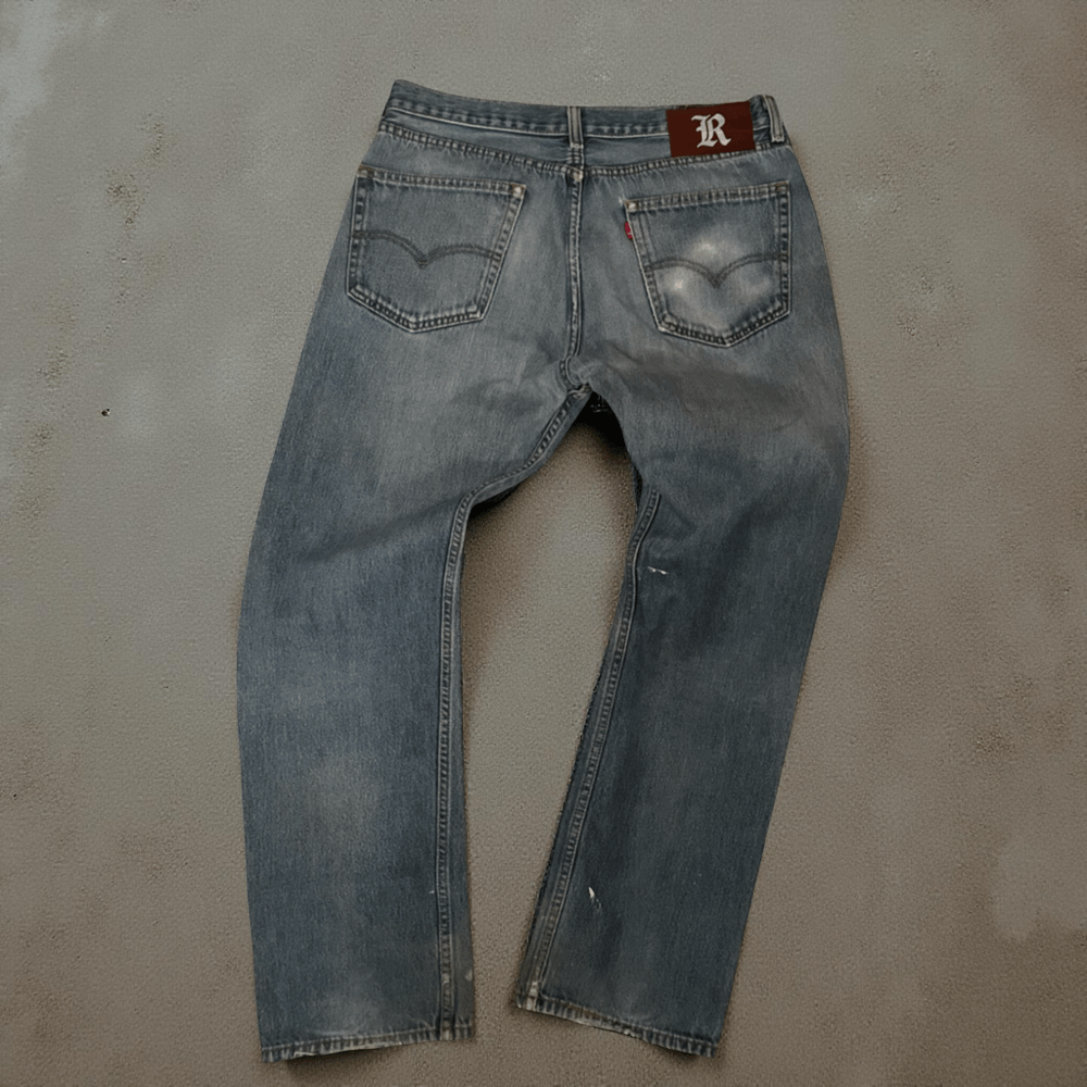 Authentic vintage Levi’s, reworked with intentional distressing, raw hems, and a red flame graphic along the lower leg. Subtle paint marks and a worn-in fade add character. Finished with a custom “leather” Reassembled back patch.