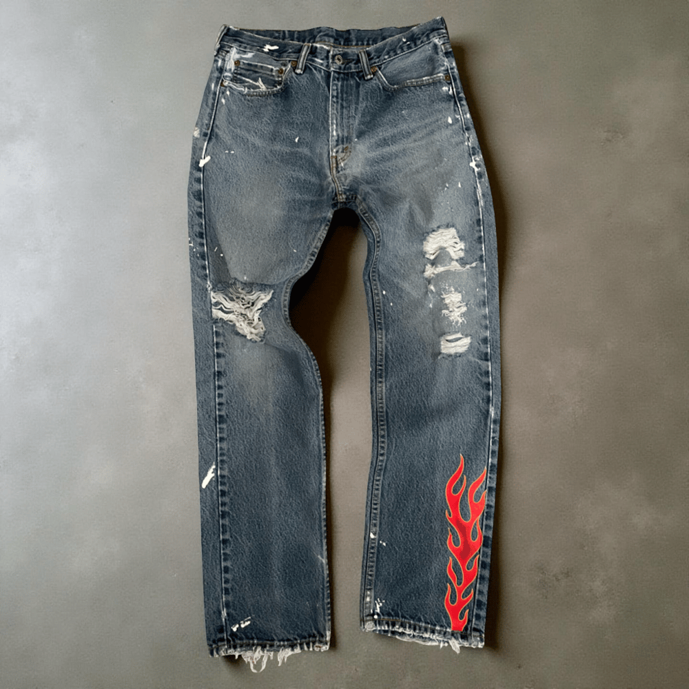 Authentic vintage Levi’s, reworked with intentional distressing, raw hems, and a red flame graphic along the lower leg. Subtle paint marks and a worn-in fade add character. Finished with a custom “leather” Reassembled back patch.