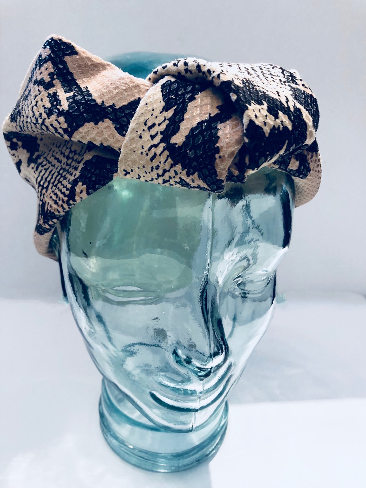 This beautiful turban headband is handmade out of genuine snake print leather.