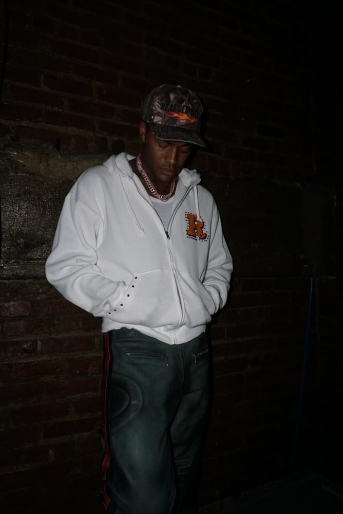 Crafted in premium white waffle-knit cotton, this hoodie features a bold marquee-inspired R patch, accented with hand-applied Swarovski crystals for a refined edge. Orange rivet detailing along the kangaroo pockets elevates the look with subtle shine. Designed with a relaxed silhouette, structured rib cuffs, and a full zip front. This piece balances comfort with statement luxury.