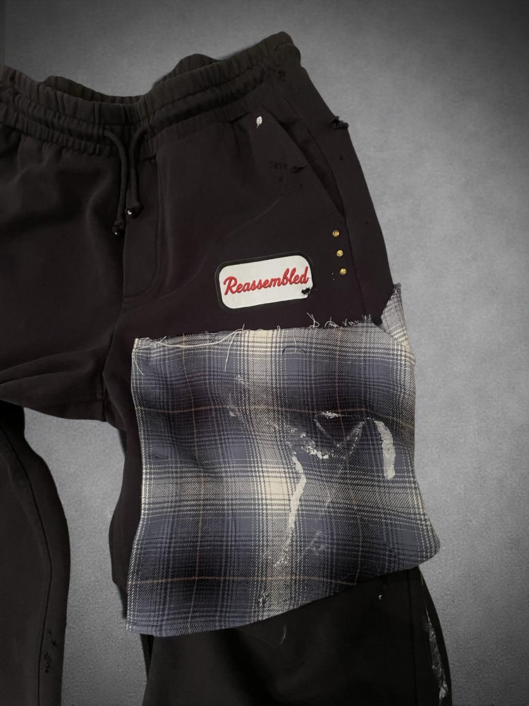 Deep charcoal gray joggers with distressed detailing, plaid flannel patchwork, crystal accents, and a Reassembled name-tag logo.
