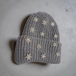 Heavy oversized knit beanie in charcoal gray featuring hand sewn Swarovski® crystal snowflake accents. Thick ribbed construction with a relaxed, slouchy fit. Warm, substantial, and statement-making.