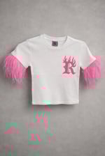 The Ostrich Feather Party Tee is crafted from soft, structured cotton and finished with bold feather-trimmed sleeves that bring movement and drama to every look.