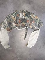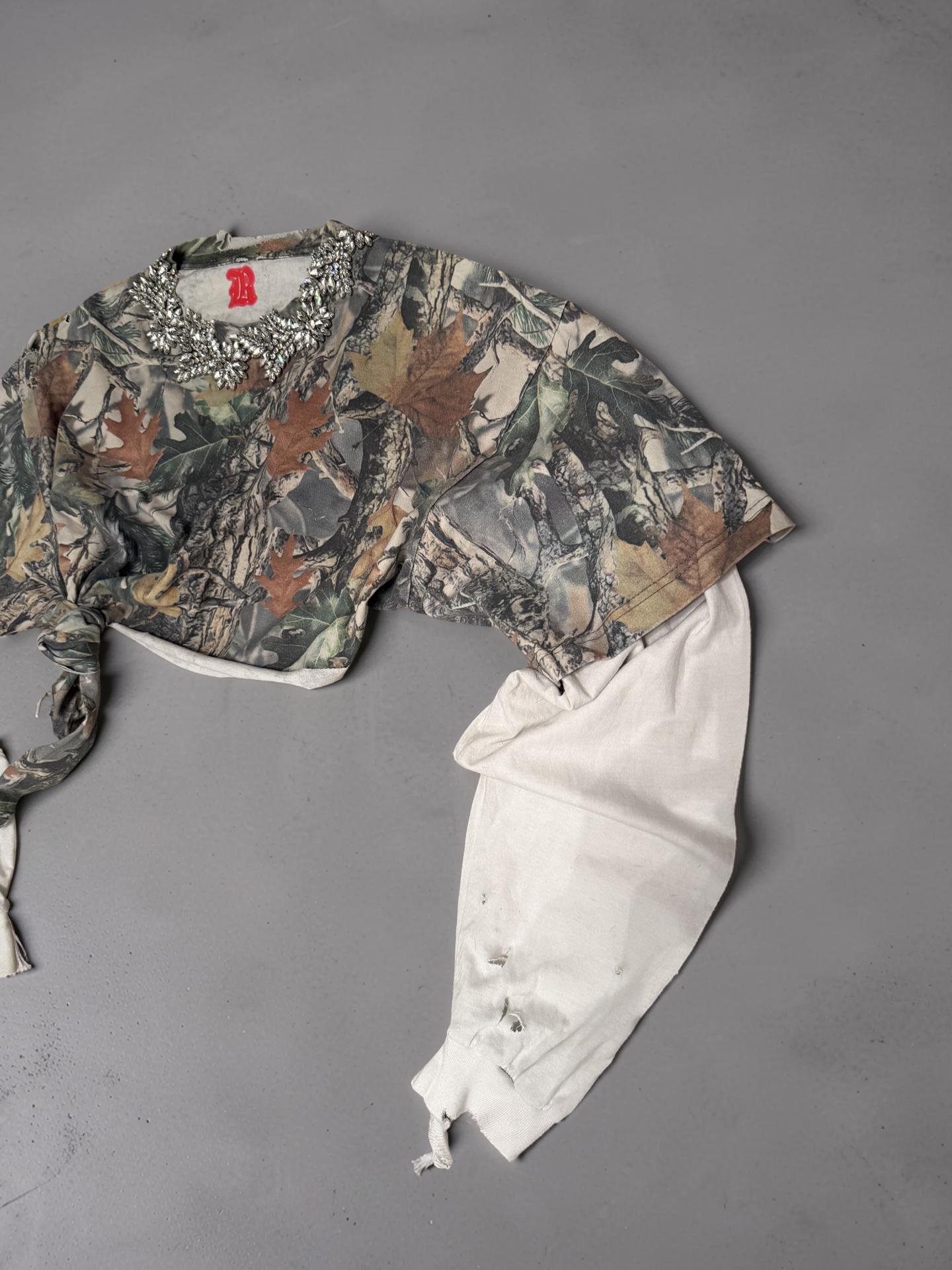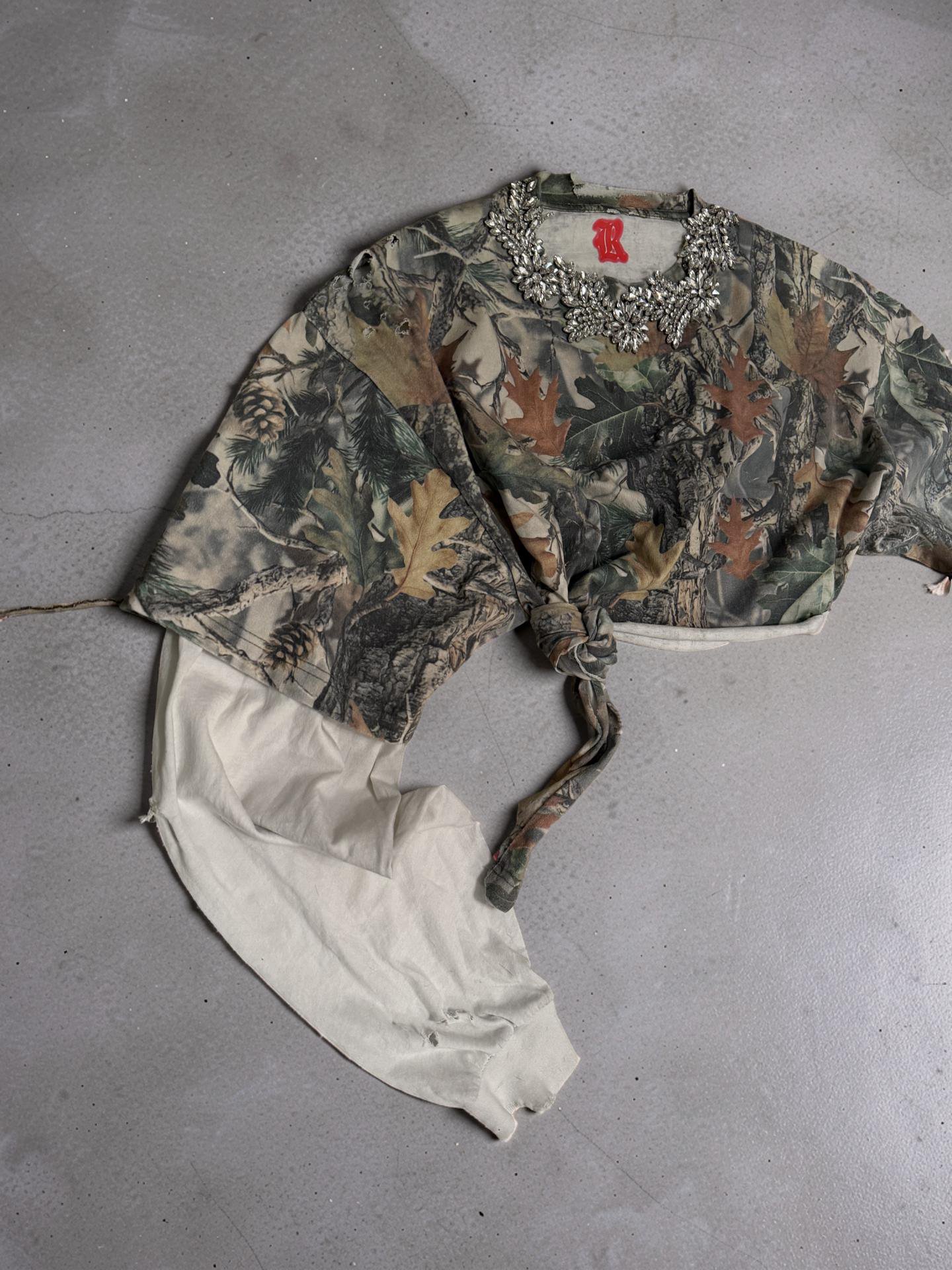The Punk Royal Camo Tee blends edge and elegance with crystal detailing at the collar. Cut from soft vintage cotton; it features distressed double-layered sleeves, and a cropped fit with a pre-knotted waist tie for easy styling. A statement piece that feels both raw and refined.