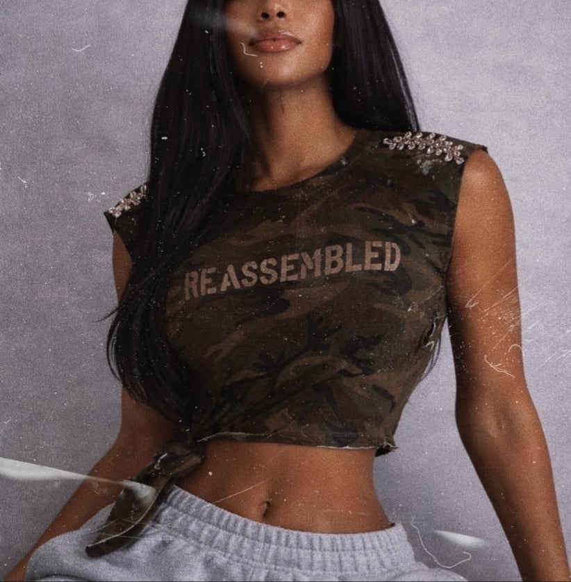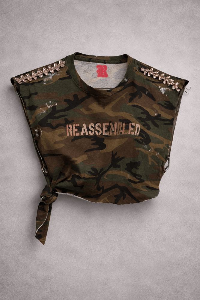 Reworked edge meets elevated detail. The R Army Baby Tee is crafted from soft, vintage-washed camouflage fabric and cut into a cropped, body-hugging silhouette with a raw, deconstructed finish. Designed with hand-distressed accents and an asymmetrical side tie, each piece carries a one-of-one feel.