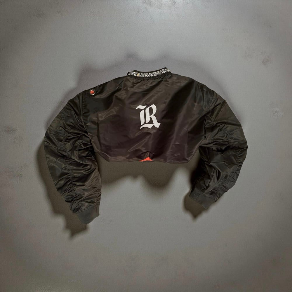 Cropped army green bomber jacket featuring a statement crystal-embellished collar for a luxe contrast against a utilitarian silhouette. Designed with ruched sleeves, a zip front closure, and a vibrant orange interior lining that adds depth and edge. Finished with a signature Old English “R” graphic on the back and a metal grommet detail at the shoulder.