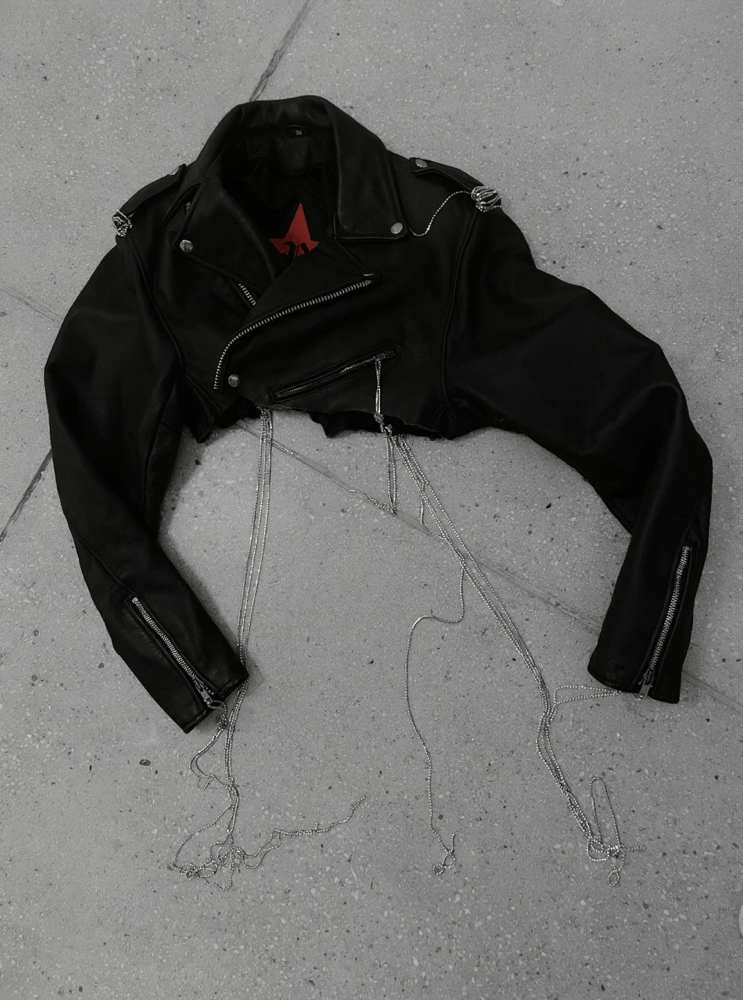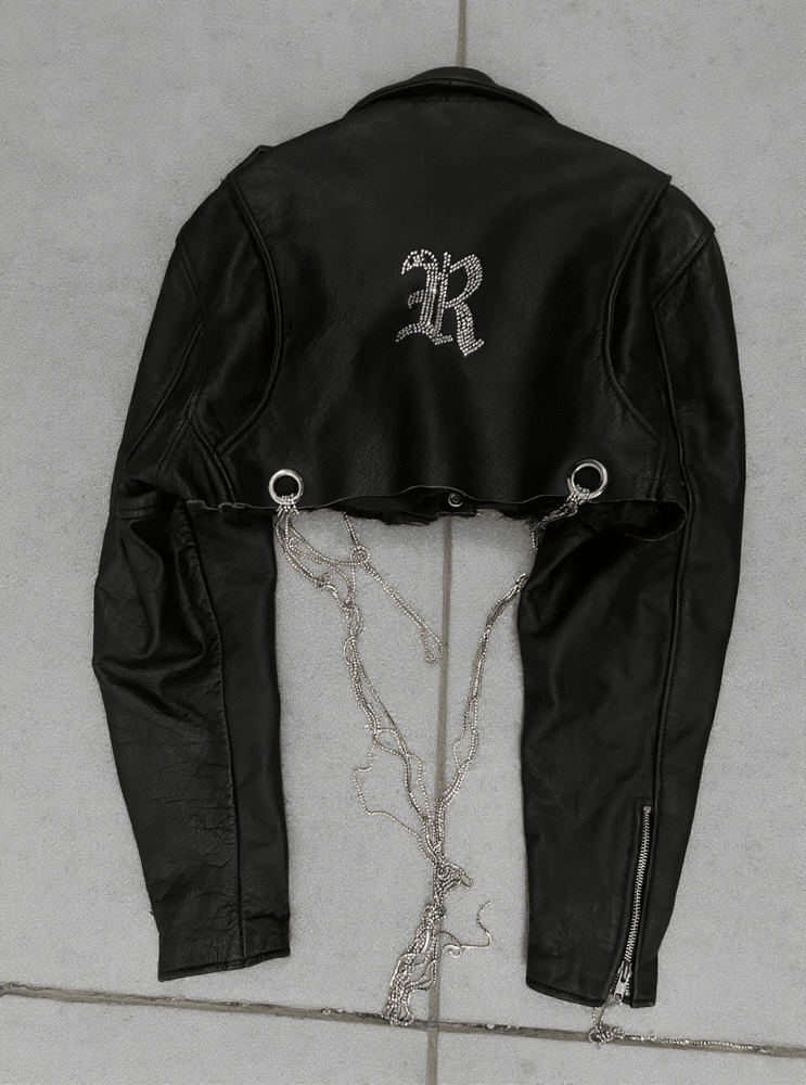 This one-of-a-kind vintage biker jacket has been reimagined by Reassembled NYC with signature edge and elevated detail. Each jacket is individually handcrafted using premium vintage leather, featuring crystal chain embellishments, oversized grommets, and our iconic crystal “R” insignia on the back. Due to the nature of vintage sourcing and custom reworking, no two jackets are exactly alike, slight variations are intentional, preserving the originality and soul of every piece.A timeless staple, rebuilt with rebellious-Cropped fit- Faux pocket detail