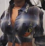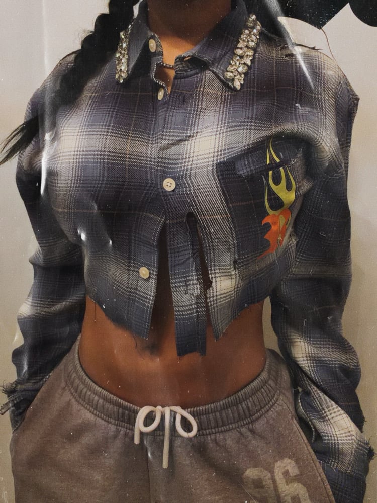 Cropped plaid button-down with a crystal-embellished collar, Old English “R” flame logo on the chest, distressing throughout and subtle paint splash detail.