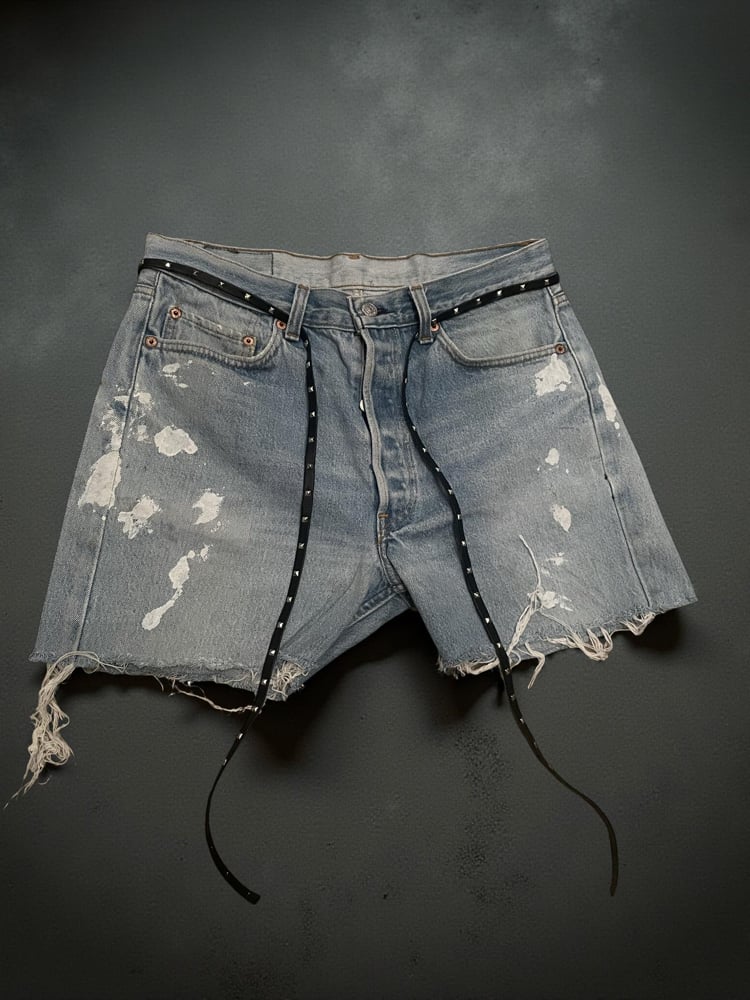 Reworked vintage denim shorts featuring heavy distressing, frayed hems, and hand-faded wash for a naturally worn look. Finished with a black leather cord belt detailed with metal studs that hangs effortlessly from the waist for a rebellious touch.
