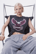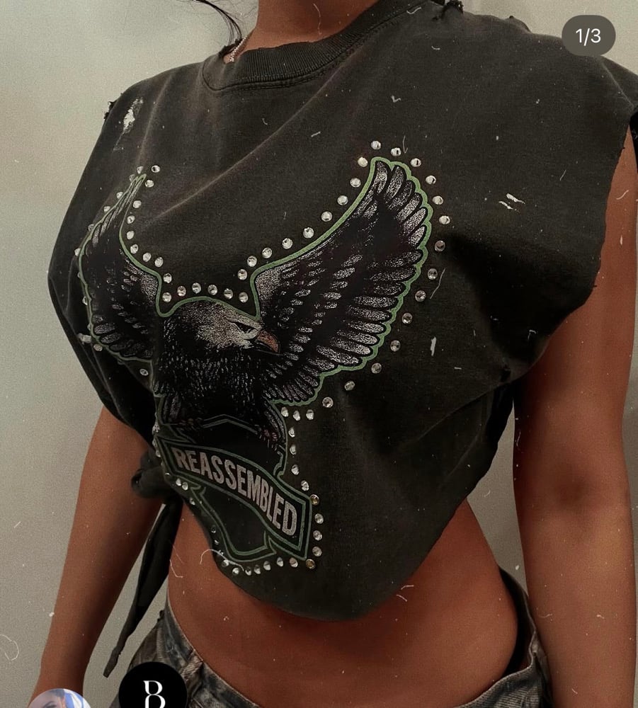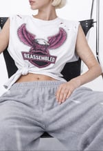 Vintage-inspired black tee featuring a bold spread-wing eagle graphic framed by a circle of Swarovski crystal and stud detailing. The chest is marked with the REASSEMBLED crest in neon pink for a sharp contrast. Each piece is heavily distressed with intentional rips, abrasions, and paint splatter accents, giving it a one-of-a-kind, worn-in character. Oversized fit.