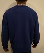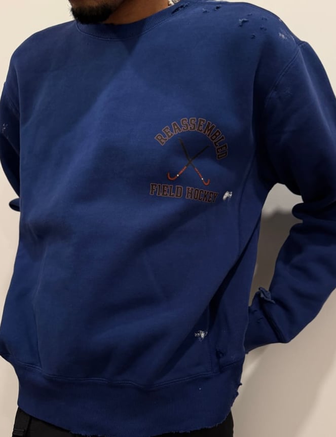 A vintage-inspired navy crewneck featuring the Reassembled Field Hockey emblem at chest. Intentionally distressed by hand with surface abrasions and frayed detailing throughout, giving each piece a lived-in, archival feel. Crafted from heavyweight cotton for structure and comfort, it balances collegiate nostalgia with modern edge