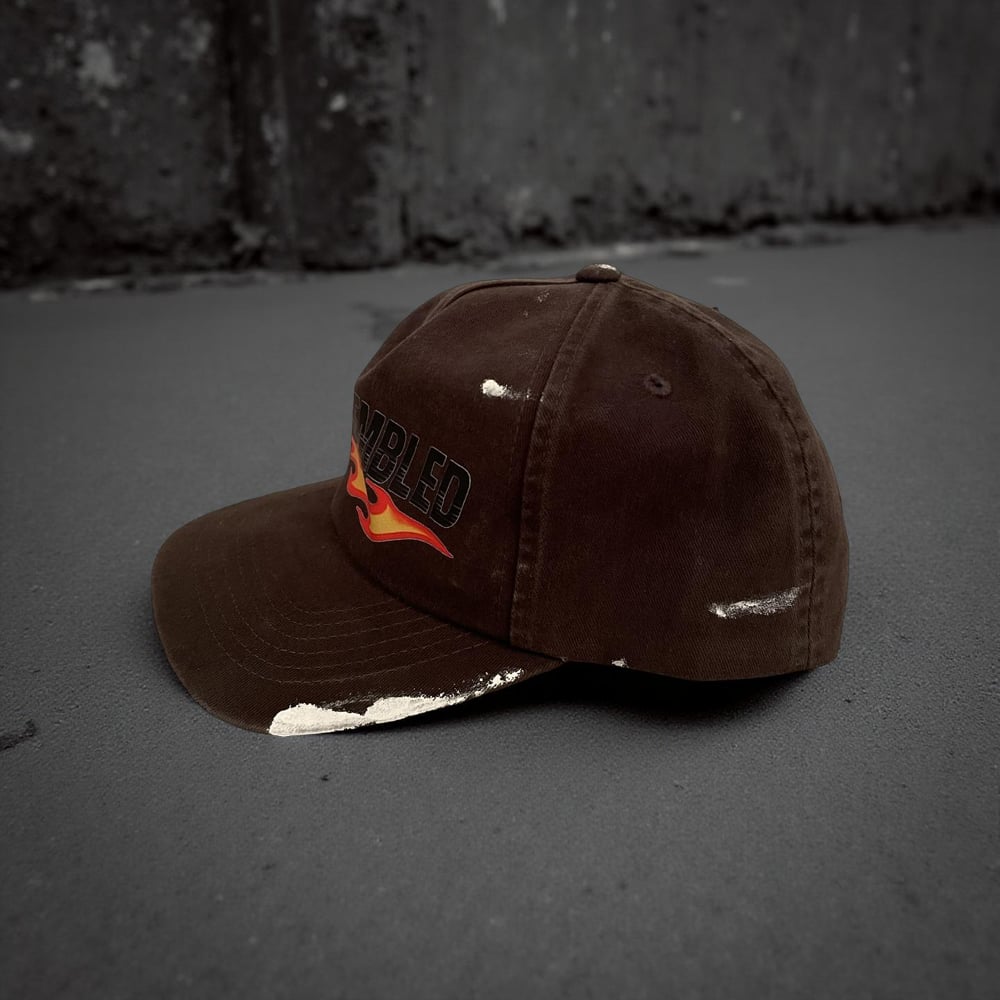 Distressed cap featuring the bold “REASSEMBLED” logo with a vibrant red and yellow flame graphic. Finished with paint-mark distressing for a worn-in, industrial edge.