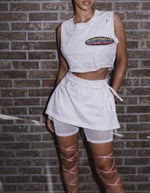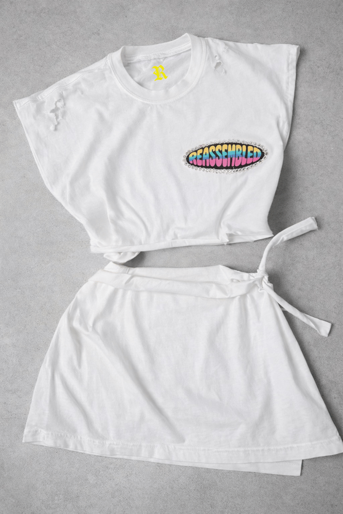 Details • Soft cotton jersey fabrication • Raw-cut cropped tee with distressed detailing • Signature multicolor Reassembled patch with crystal trim • Matching sarong wrap skirt with adjustable side tie • Lightweight, breathable, and easy to style