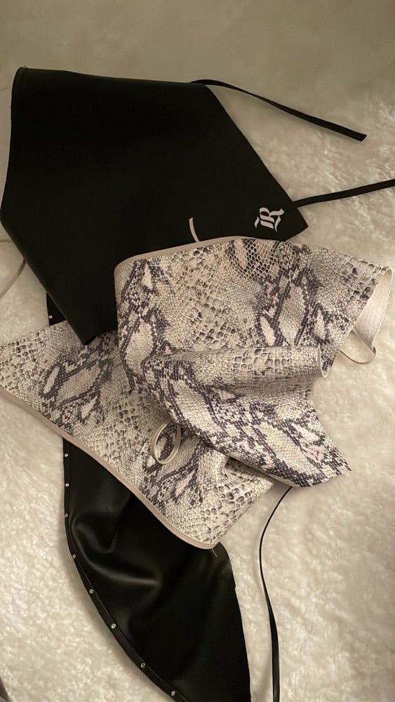 Crafted from premium Italian leather, this statement piece redefines the classic bandana with a bold, elevated edge. Detailed with metal crystal stud accents and finished with the signature Old English R logo, it’s designed to be worn effortlessly as both a scarf and a headpiece.