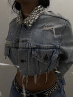 Statement meets vintage. This one-of-one piece features an oversized Swarovski crystal–embellished collar that catches light from every angle, set against a perfectly thrashed vintage denim base.