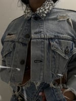 Details:• Authentic vintage denim• Oversized Swarovski crystal collar• Cropped fit with raw hem• Natural distressing throughout• Fits size small
