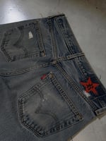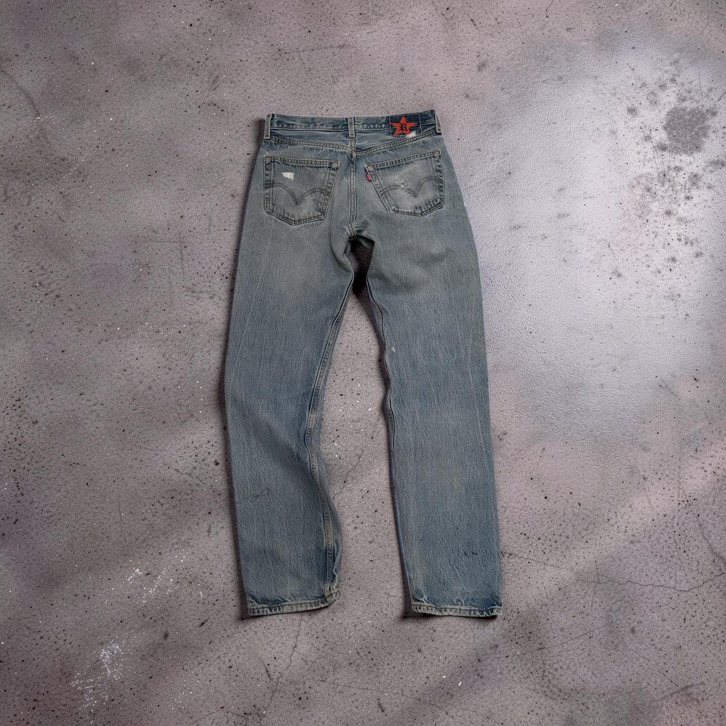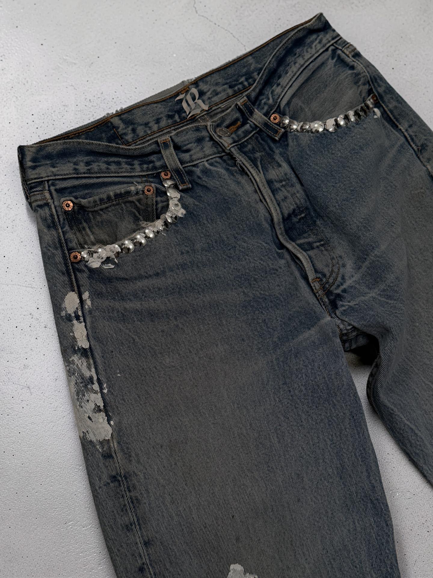 Medium wash with light distressing and paint splatters. Silver studded detailing along both pockets.