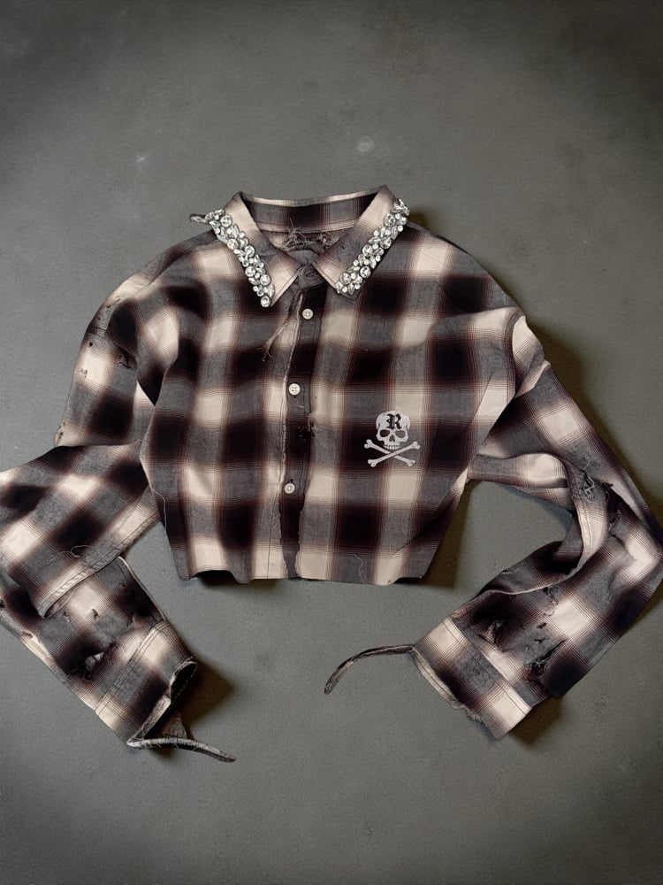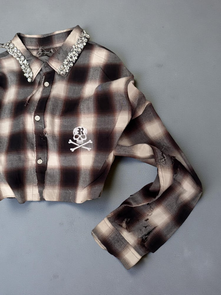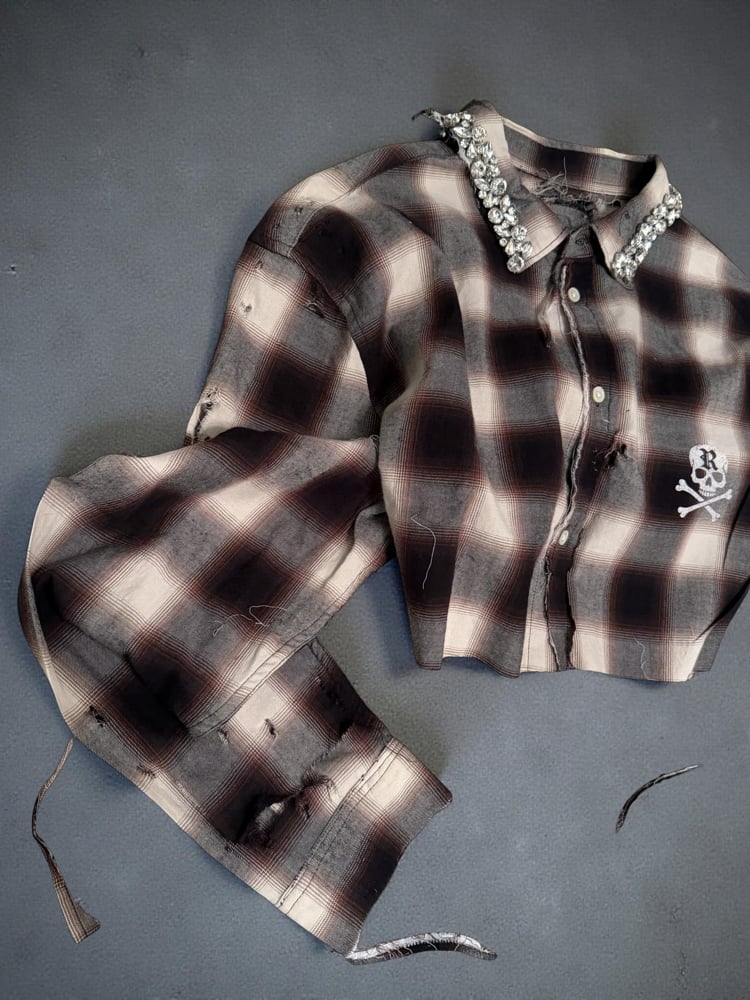 Featuring a statement crystal-embellished collar that contrasts the raw, worn-in flannel base. Finished with intentional distressing throughout, extended sleeves, and signature Reassembled skull decal at the chest.