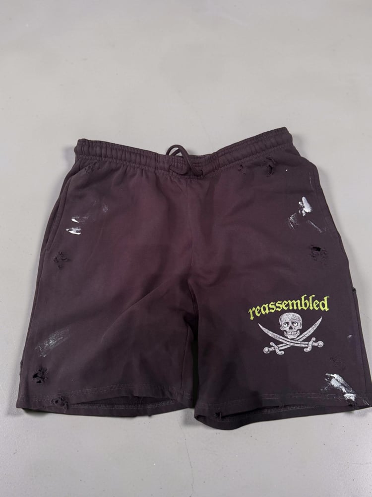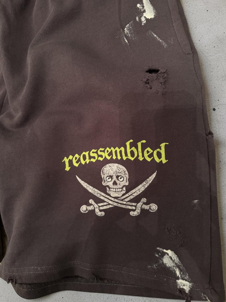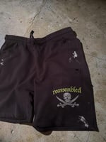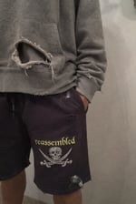 Deep charcoal gray distressed sweatshorts featuring the signature Reassembled skull and crossed swords graphic in a vintage off-white print with neon chartreuse Old English lettering. Designed with a relaxed streetwear silhouette, these shorts have an elastic waistband with drawstring for an adjustable fit.