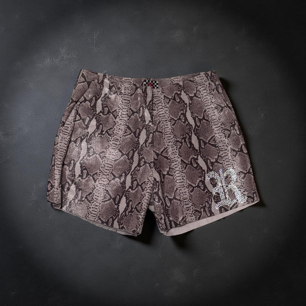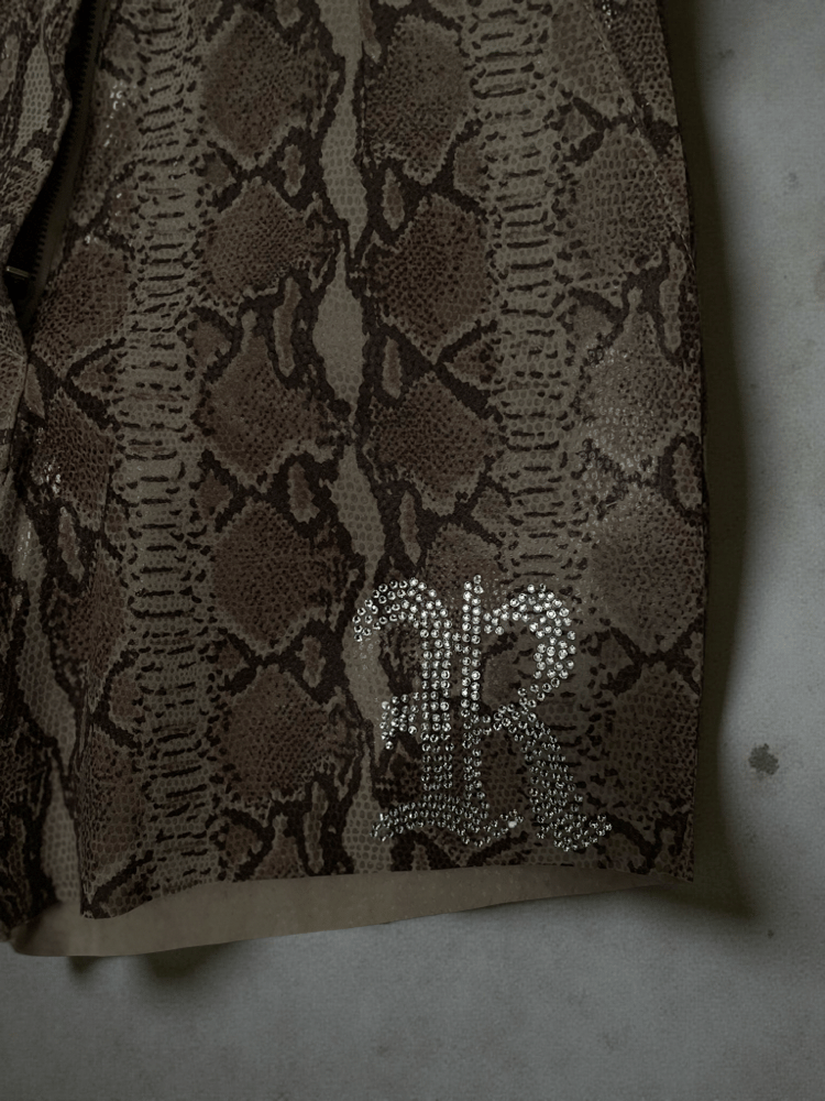 Crafted from real leather, the “Viper” shorts strike the perfect balance between raw edge and elevated detail. The bold snake print brings texture and attitude, while a hand-laid crystal Old English R adds a hit of luxe. Finished with raw hems and a signature checker tab at the fly, these are unapologetically bold — designed to turn heads and hold weight.