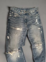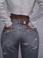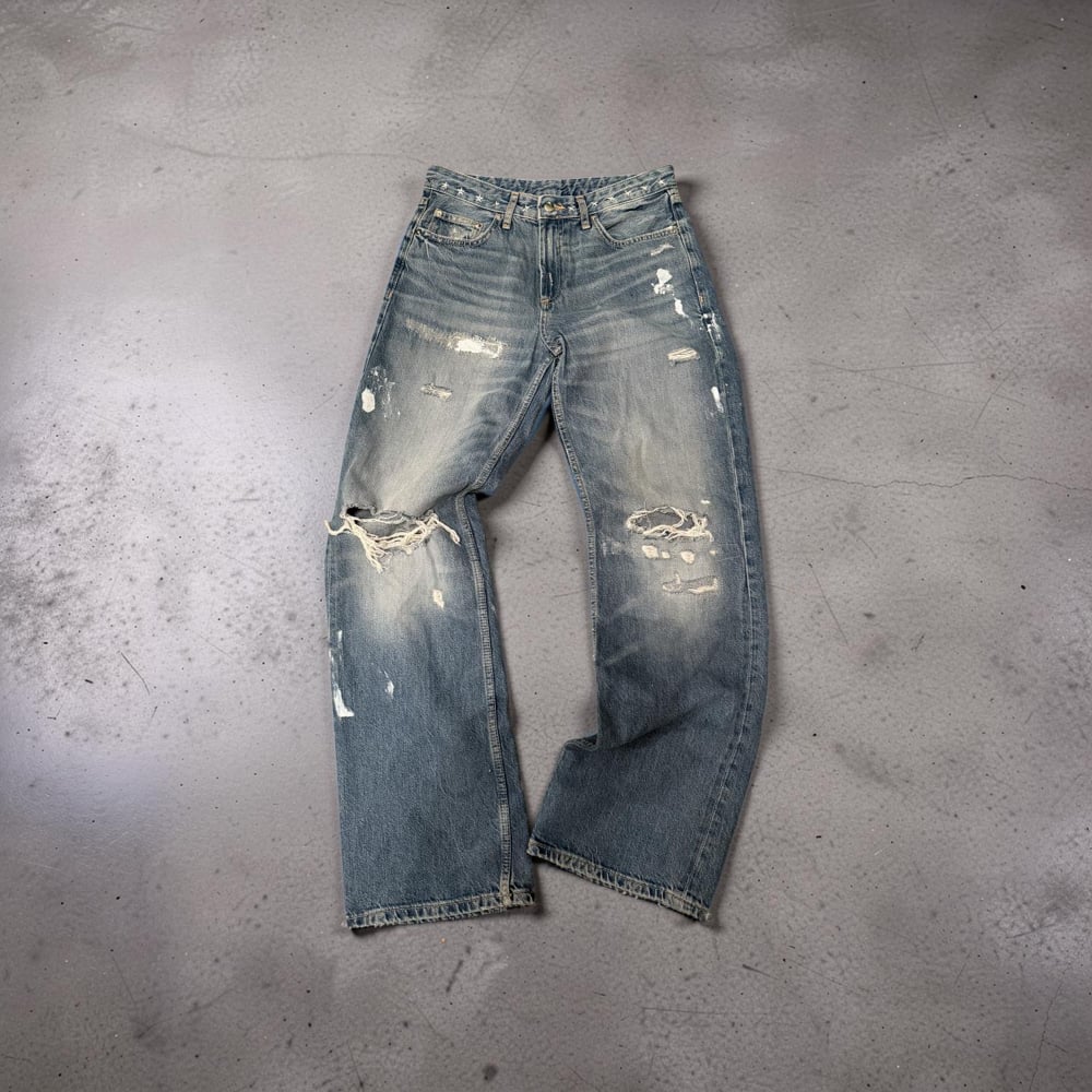 Midweight, structured denim with a broken-in feel. Designed with aggressive distressing, layered abrasions, and paint splatter detailing throughout. Finished with metal star hardware along the waistband for a subtle statement edge. Relaxed straight fit with natural stacking.
