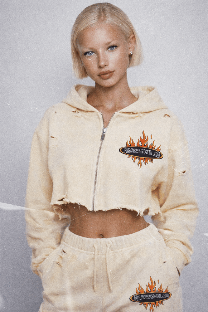 Finished with a raw cut hem for an undone edge and a signature Reassembled flame graphic at the thigh, blending street energy with beachside ease.