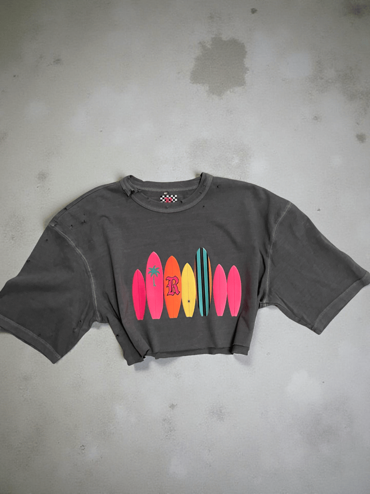 This semi cropped tee features a lineup of vibrant surfboards with the signature R and palm detail front and center. Soft stretch cotton , distressed detailing and a loose comfortable fit that pairs perfectly with denim or swim.