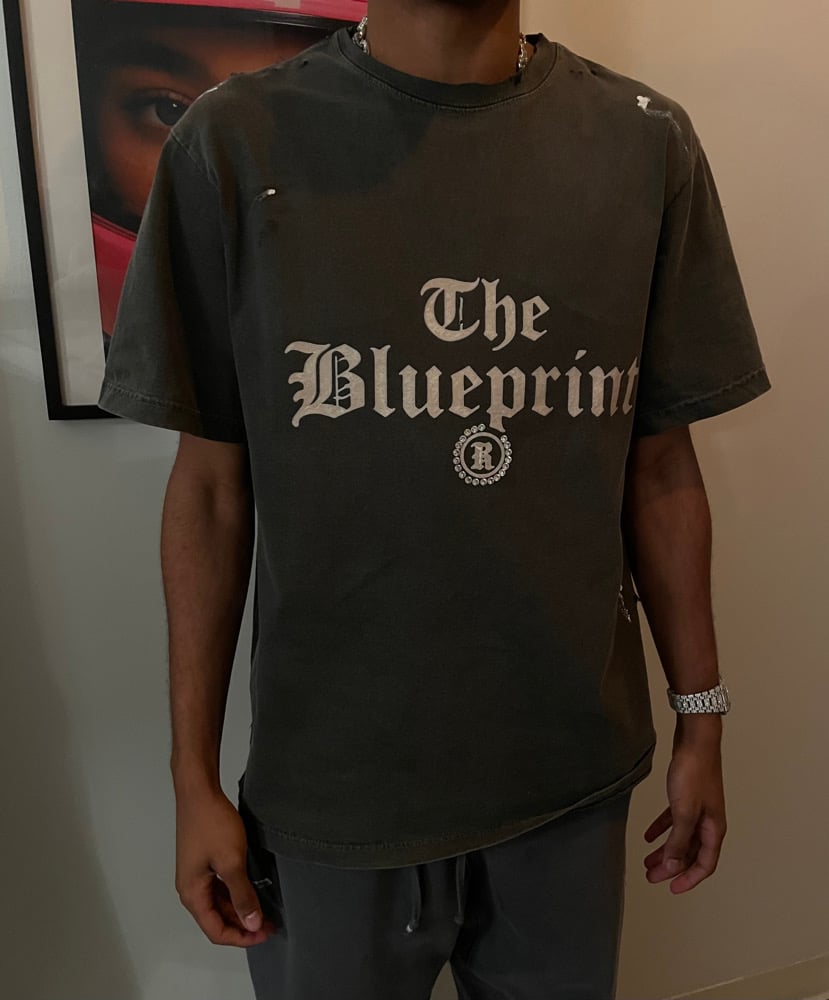 Washed charcoal tee with distressed details, bold ‘The Blueprint’ Old English lettering, and signature Reassembled ‘R’ emblem at center